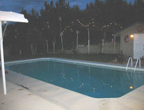 As you can see, the pool is ground level and the back yard has lots of interesting things to look at. So, off goes Elsie to have a look around. I call it just plain nosey .... Hops, being of similar nature, follows Elsie on her tour of snooping. By this point, we had achieved a sort of armed truce between the 4 "hounds" and peace was reigning. I'm sitting, of course, chatting with Lou when all of a sudden, we hear a small splash and a loud scream from Elsie followed by a substantially louder splash. We look up and see Hops in the middle of the pool desperately trying to learn how to swim. Elsie was several feet behind her attempting to push her to the pool side. Casually, I got up and wandered over to pool side and grabbed Hops by the collar and whipped her onto solid ground. I was about to do the same thing for Elsie, but as there was no collar, I returned to my chair and my conversation with Lou. Now, we had one soaked dog, and one soaked Elsie. Towels were produced and off Elsie went to change. Lou and I went back to our conversation; I think that we were on the cusp of solving one of the world's most critical problems ... world hunger, SARS or the common hangnail, when we heard yet another slightly larger splash then the one that proceeded the previous excitement.